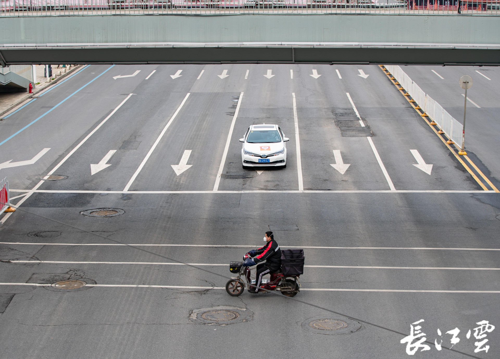2020年2月19日,此时武汉的马路上,仅剩志愿者车辆和外卖快递员的电动车。