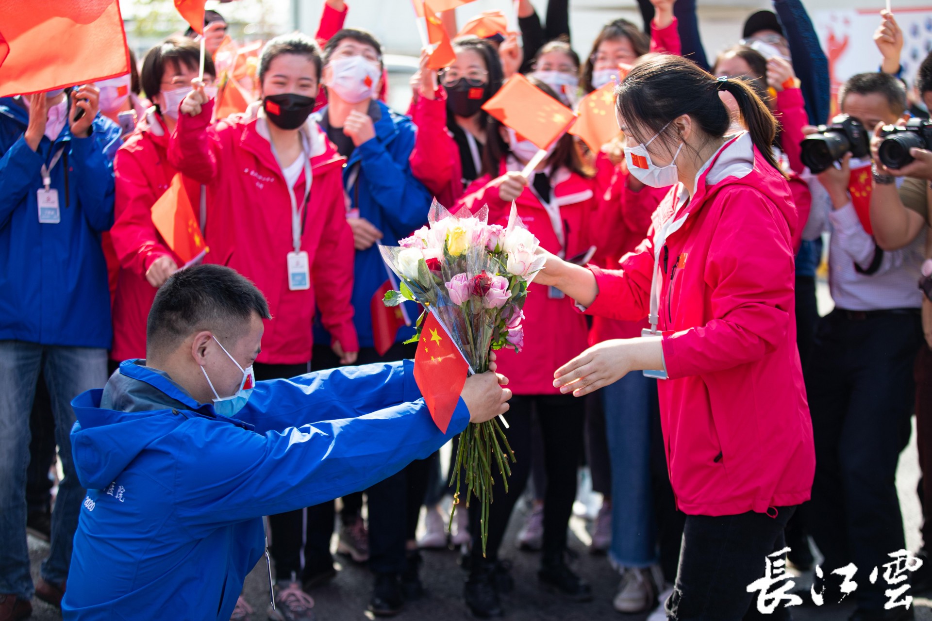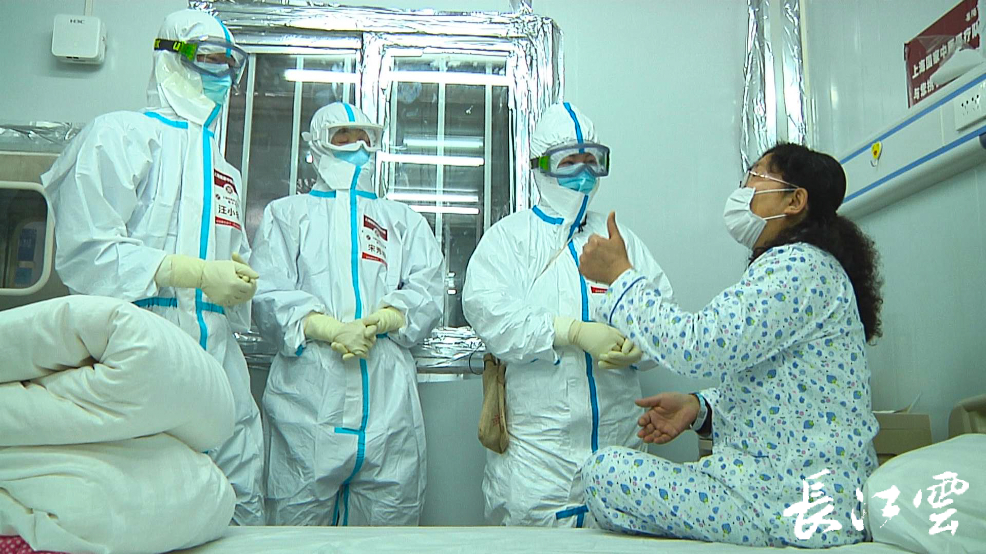 新冠患者对援鄂医疗队员们竖起大拇指。