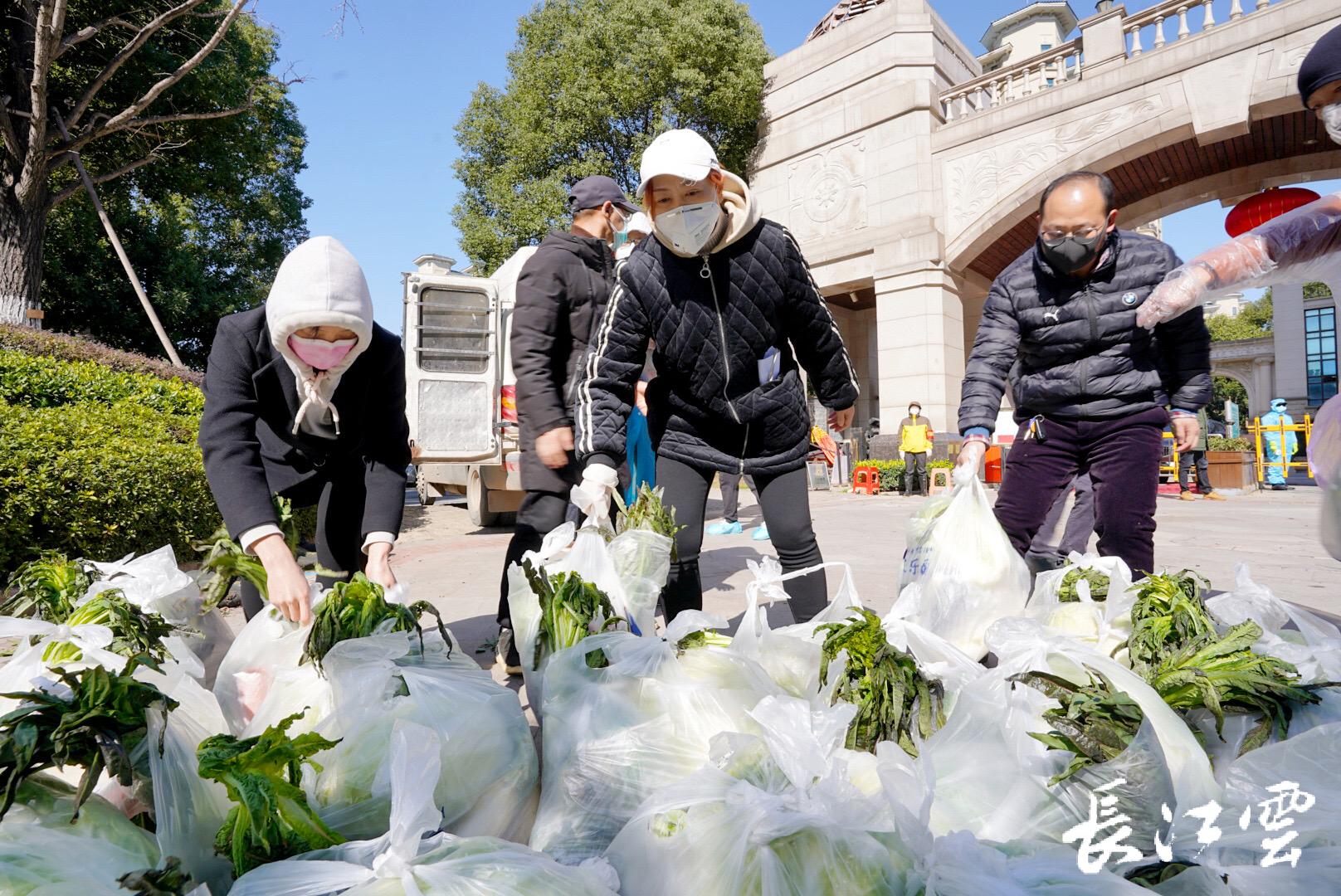 2020年2月17日,武汉一小区门口,社区工作者和小区志愿者正在清点搬运居民的团购菜。