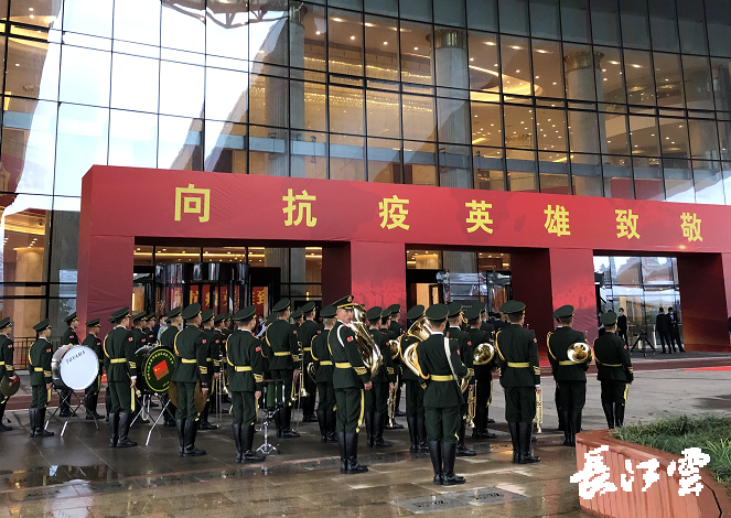 受表彰的抗疫代表们在军乐团演奏的礼乐声中纷纷进场。