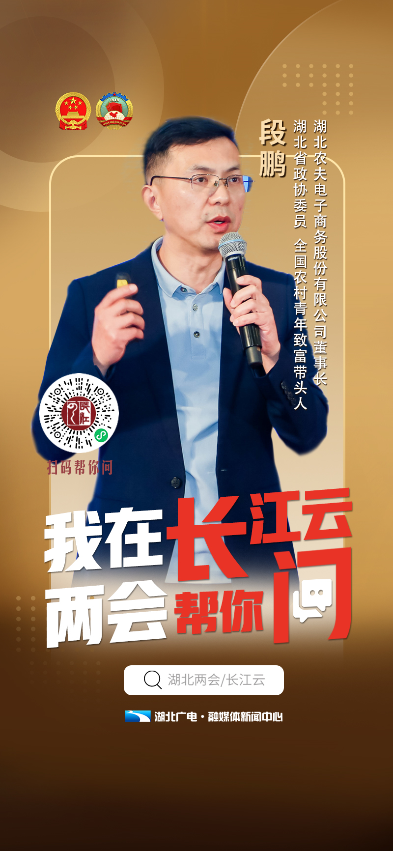 “我在长江云,两会帮你问!”2021年湖北“两会”召开之际,湖北省政协委员、全国农村青年致富带头人、湖北农夫电子商务股份有限公司董事长段鹏入驻长江云头条频道。广大网友可以通过长江云为代表委员们订制的“民意带言小程序”与段鹏委员互动。一起来为湖北高质量发展来一次云端“头脑风暴”吧!