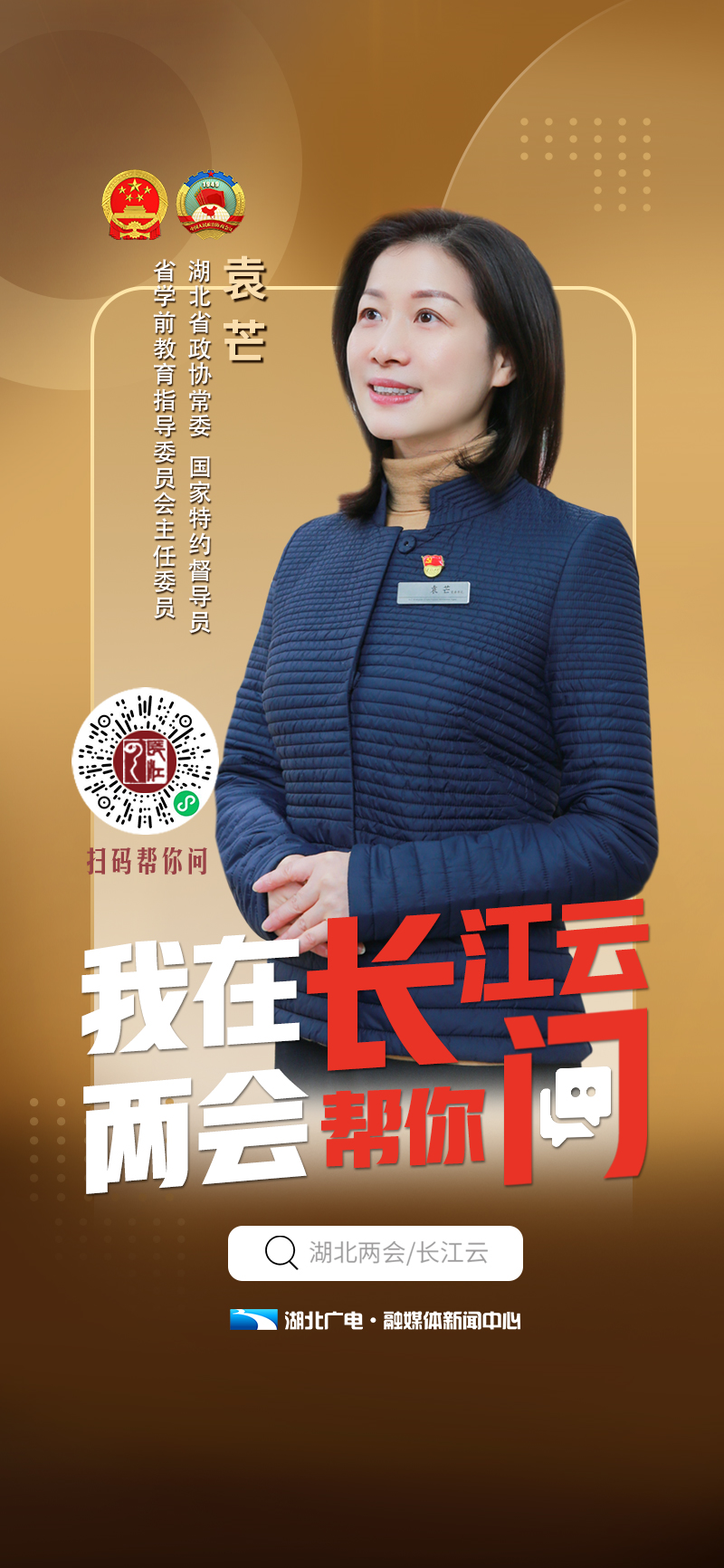 “我在长江云,两会帮你问!”2021年湖北“两会”召开之际,湖北省政协常委、国家特约督导员、省学前教育指导委员会主任委员,正高级教师、武汉市首批学科带头人袁芒入驻长江云头条频道。广大网友可以通过长江云为代表委员们订制的“民意带言小程序”与袁芒委员互动。一起来为湖北高质量发展来一次云端“头脑风暴”吧!