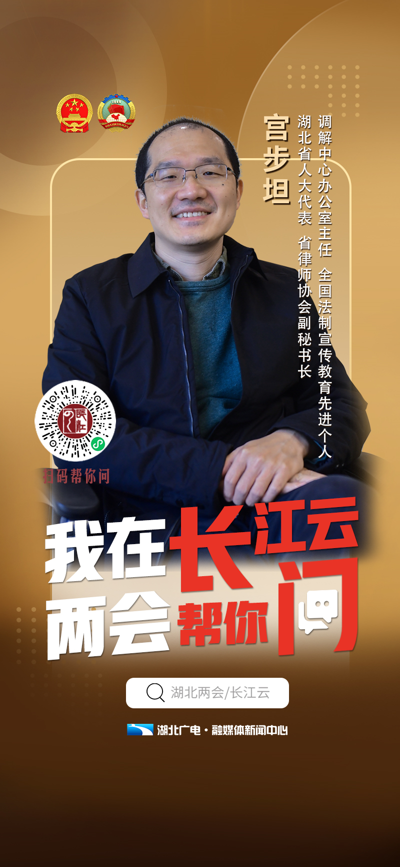 “我在长江云,两会帮你问!”2021年湖北“两会”召开之际,湖北省人大代表,省律师协会副秘书长、调解中心办公室主任,全国法制宣传教育先进个人宫步坦入驻长江云头条频道。广大网友可以通过长江云为代表委员们订制的“民意带言小程序”与宫步坦代表互动。一起来为湖北高质量发展来一次云端“头脑风暴”吧!