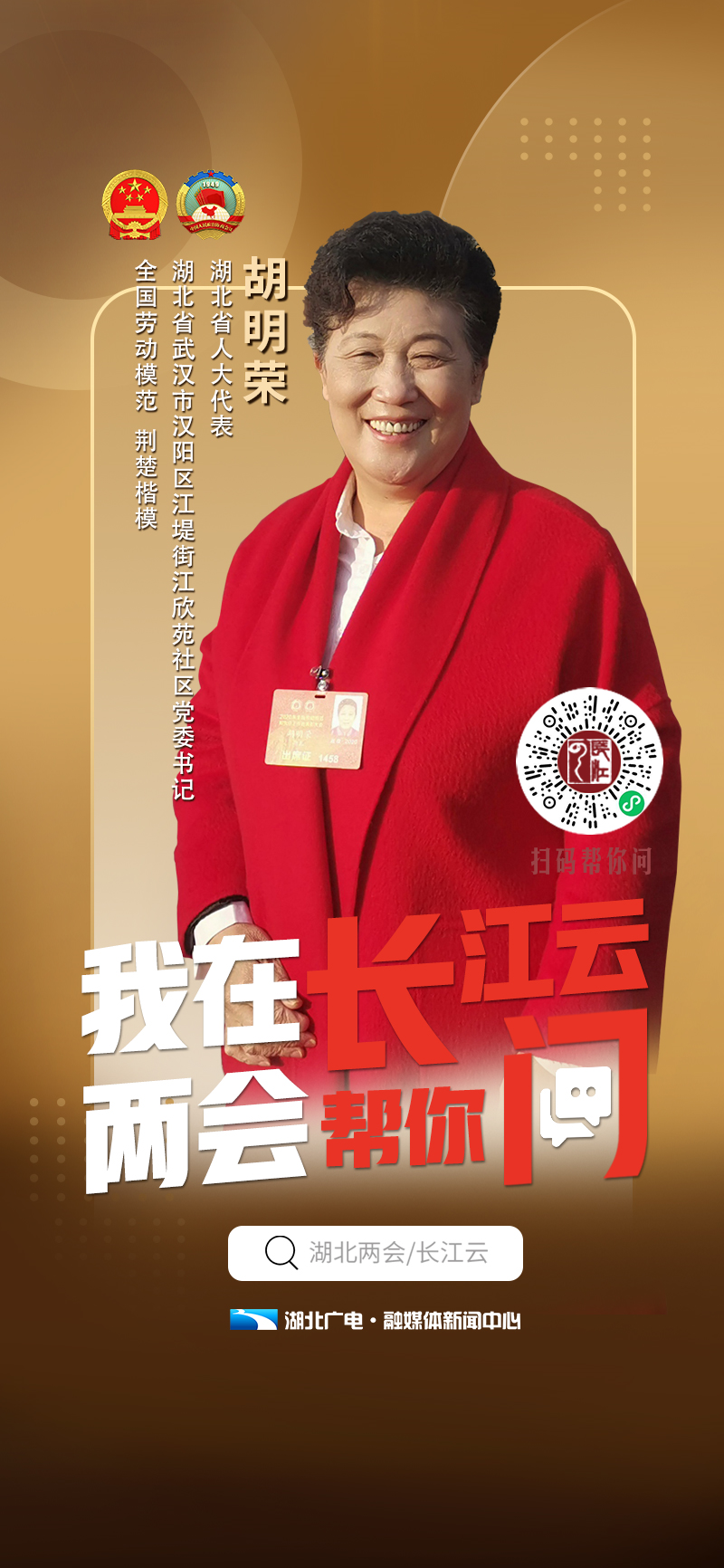 “我在长江云,两会帮你问!”2021年湖北“两会”召开之际,湖北省人大代表、湖北省武汉市汉阳区江堤街江欣苑社区党委书记、全国劳动模范、荆楚楷模胡明荣入驻长江云头条频道。广大网友可以通过长江云为代表委员们订制的“民意带言小程序”与胡明荣代表互动。一起来为湖北高质量发展来一次云端“头脑风暴”吧!