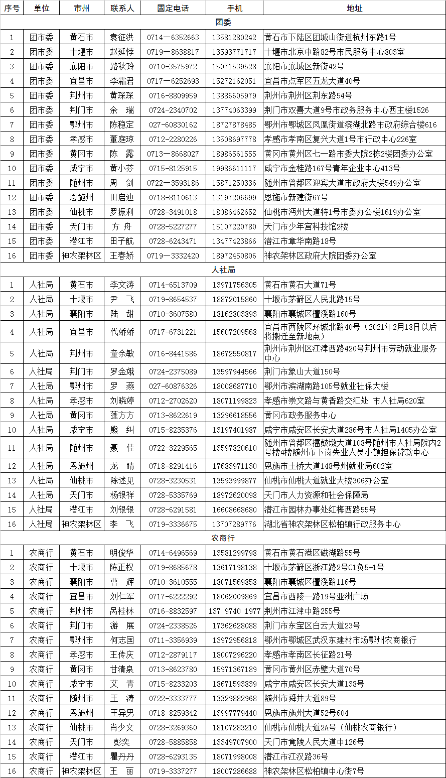 湖北“青创贷”联络人员汇总表