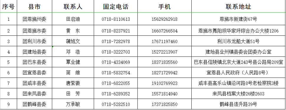 湖北“青创贷”恩施州联络人员汇总表