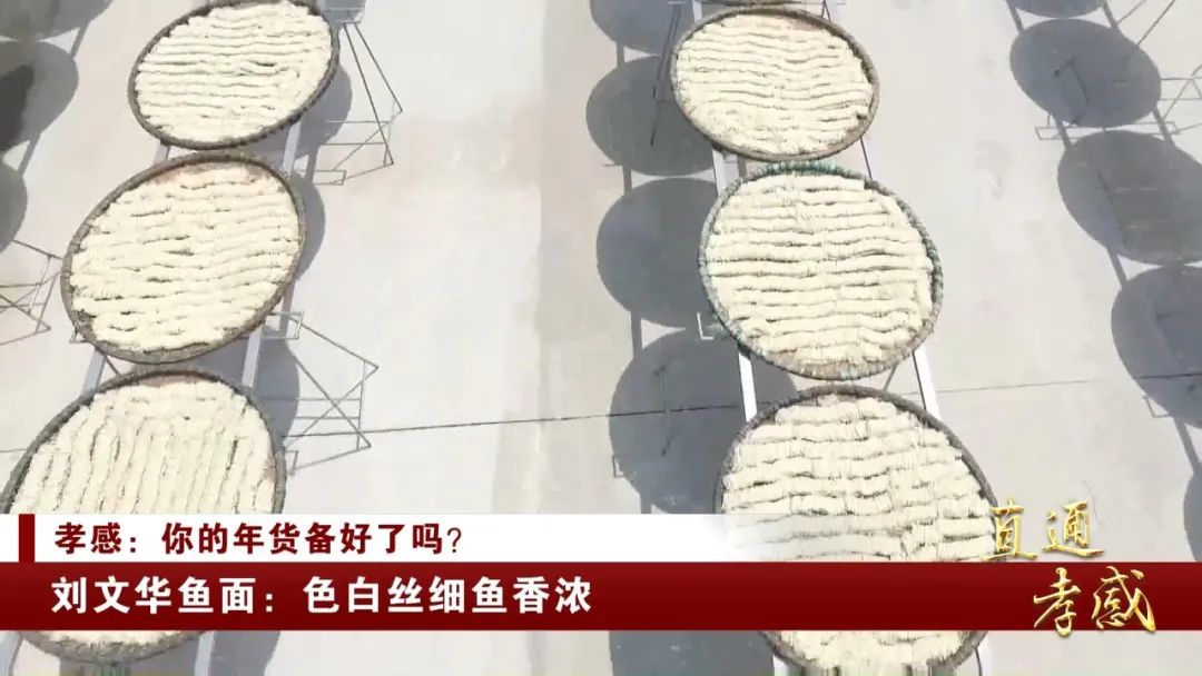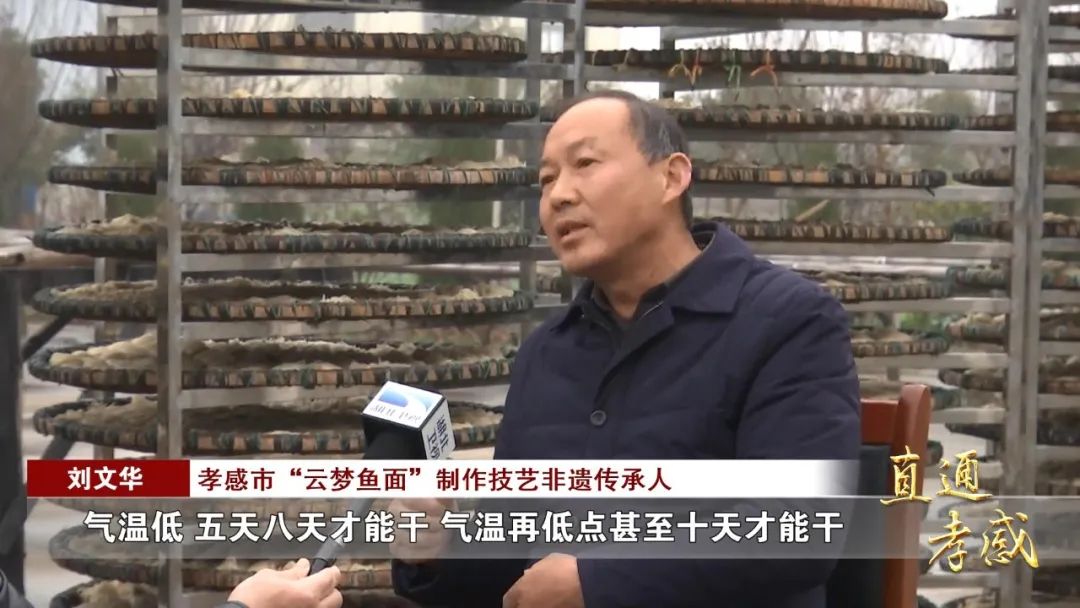 孝感市“云梦鱼面”制作技艺非遗传承人刘文华:“干了以后有一种阳光的味道,鱼面也是这样,你如果是用自然光在太阳下晒干,五天八天才能干,气温再低十天才能干,做一天的面需要一个星期以上才能干,但是它这个原汁原味,吃起来口感就不一样。”