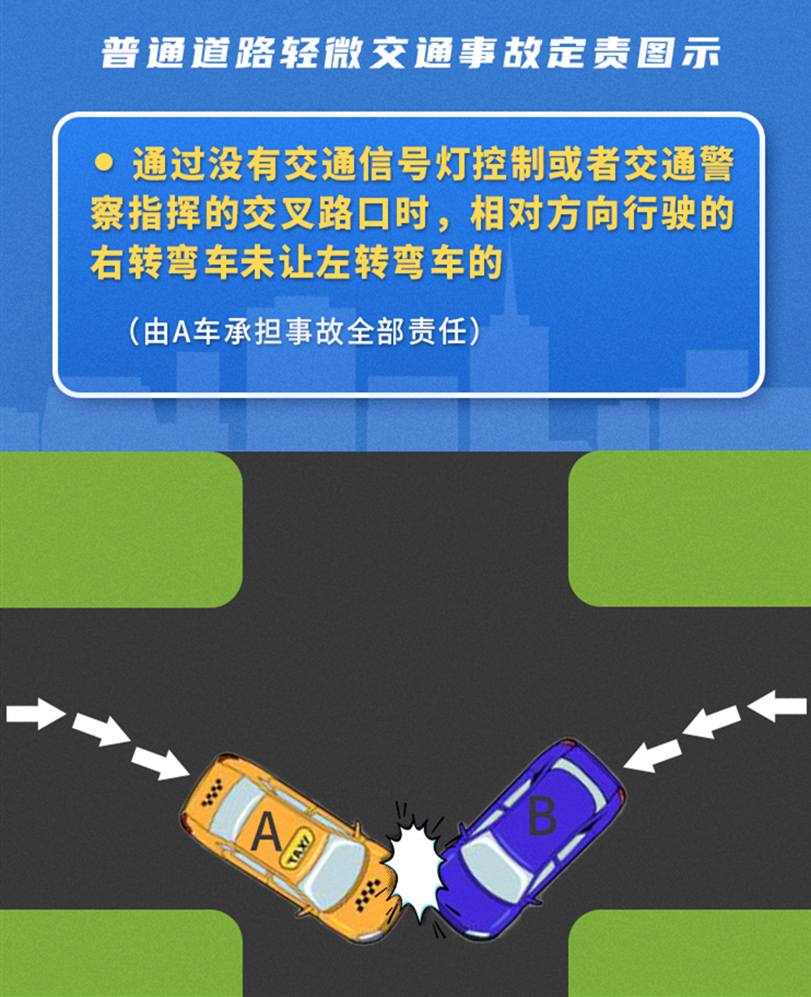 10.通过没有交通信号灯控制或者交警指挥的交叉路口时,相对方向行驶的右转弯车未让左转弯车而发生事故的,这样定责↓↓↓