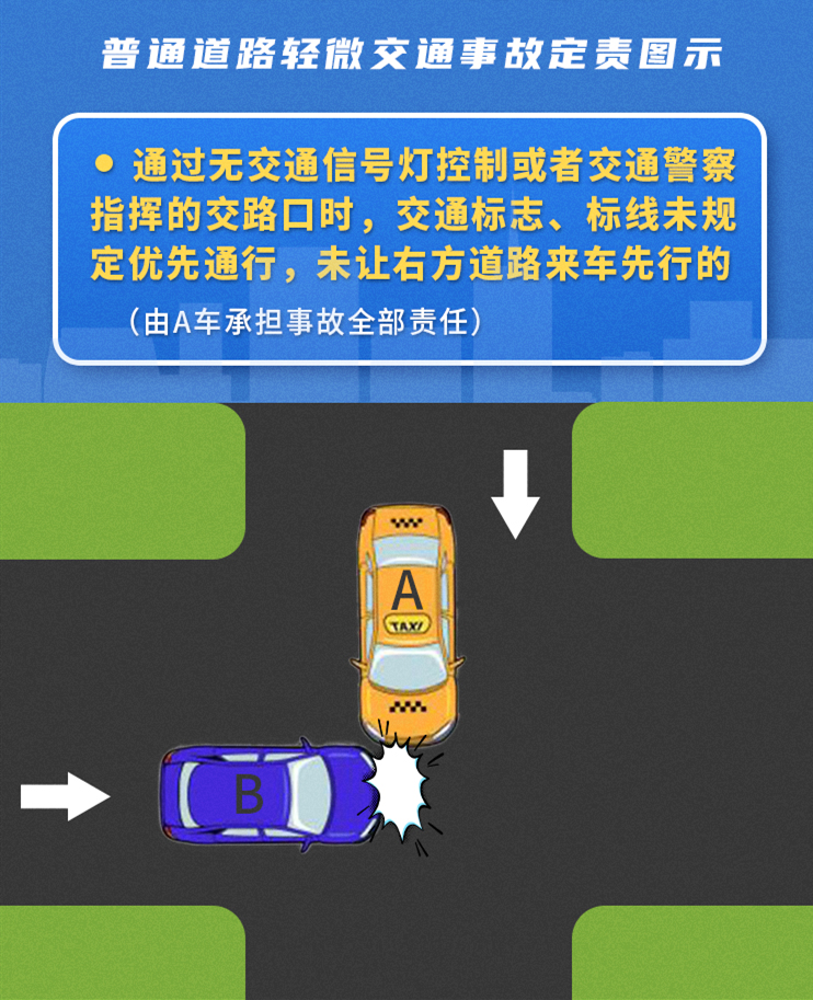 7.通过无交通信号灯控制或者交警指挥的交路口时,交通标志、标线未规定优先通行,未让右方道路来车先行而发生事故的,这样定责↓↓↓
