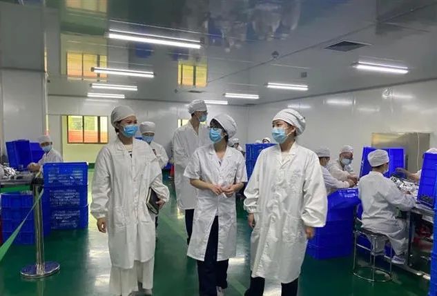 图为咸宁市咸安区税务局税务干部(左一)在真奥金银花药业公司生产车间了解生产情况