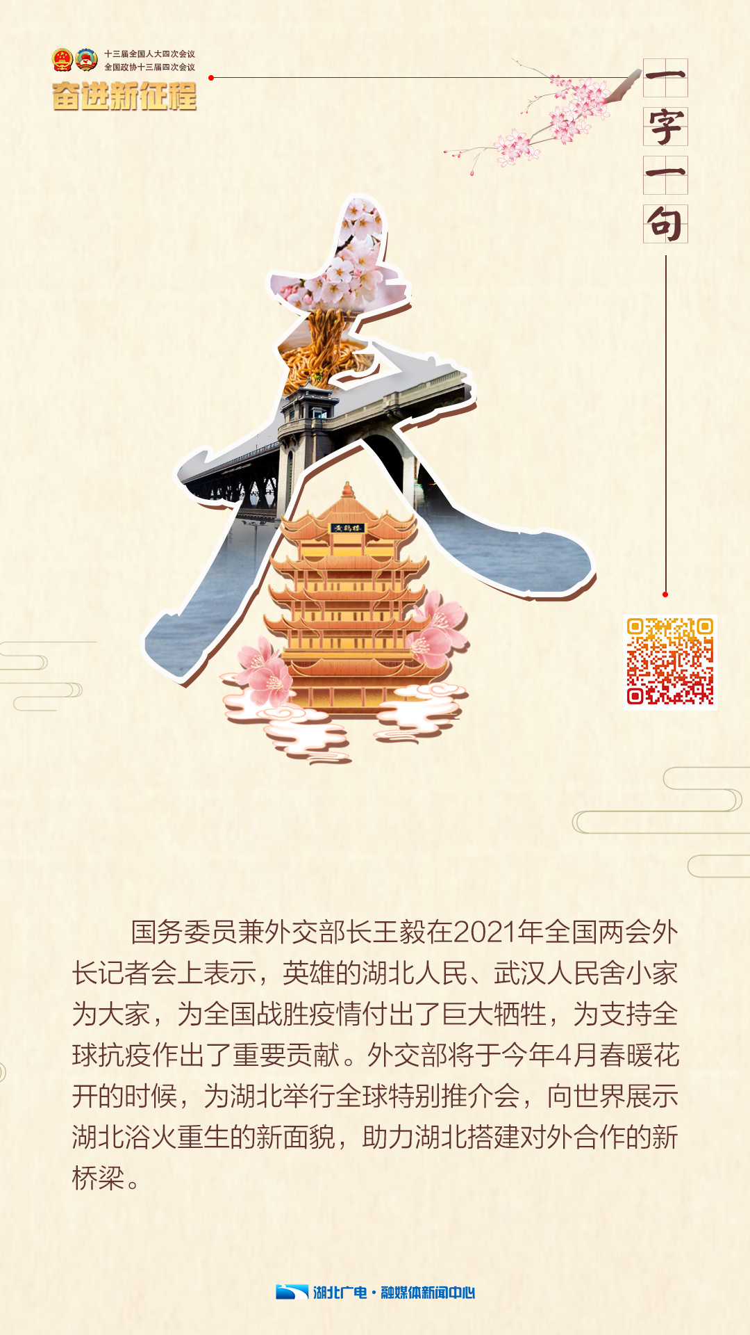 湖北广电融媒体推出“全国两会 一字一句”系列海报,每期推出一个字,结合两会热点,传递两会声音,讲好中国故事。