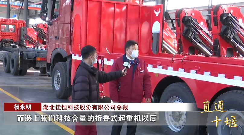 湖北佳恒科技股份有限公司总裁杨永明:“就拿这台车来说,底盘售价大概就在三十多万、四十万元,而装上我们科技含量的折叠式起重机以后,我们的售价高达一百五六十万。”