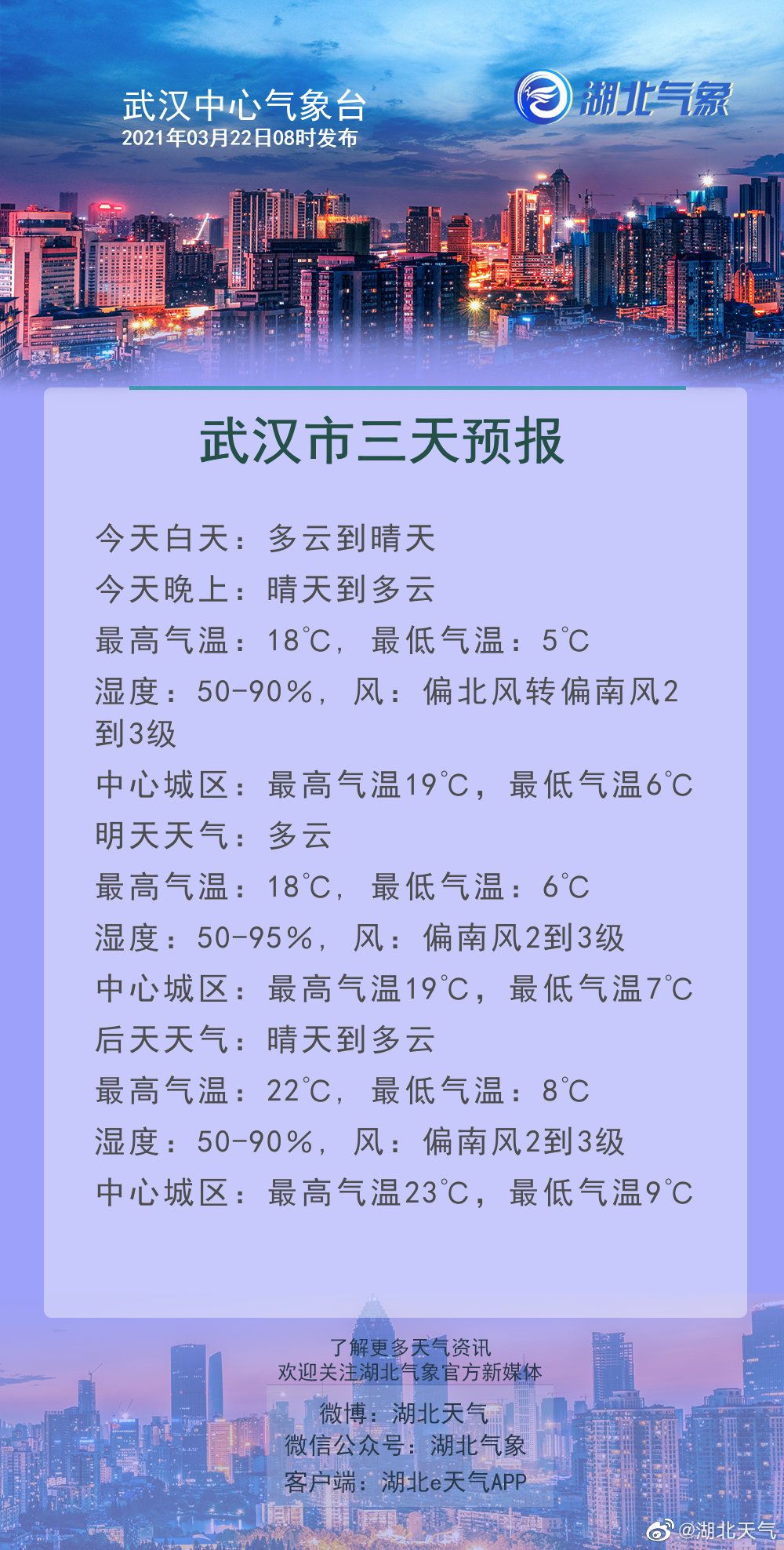 未来三天,受高空西北气流控制,湖北省大部分地区为多云到晴的天气,气温将逐步回升。今天大部分地区最高气温在17~20℃,明天还会小幅上升,后天全省高温将达到22~25℃。虽然高温显著上升,但明天早上大部分地区低温只有4~7℃,温差较大,公众要注意及时增减衣物。