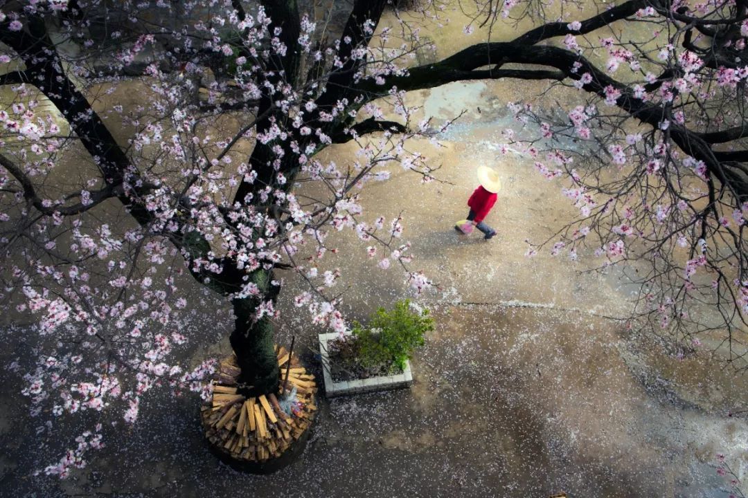 “沾衣欲湿杏花雨,吹面不寒杨柳风”,杏花,随着花瓣的伸展,色彩由浓转淡,到谢落时成了雪白一片。
