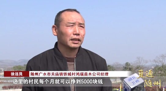 随州广水市关庙镇铁城村鸿瑞苗木公司经理徐远艮:“我们去年来这里考察,环境好、水好、道路宽,我们立马就投资500多万,在这里搞一个苗木基地,这里的村民每个月就可以挣到5000块钱。”