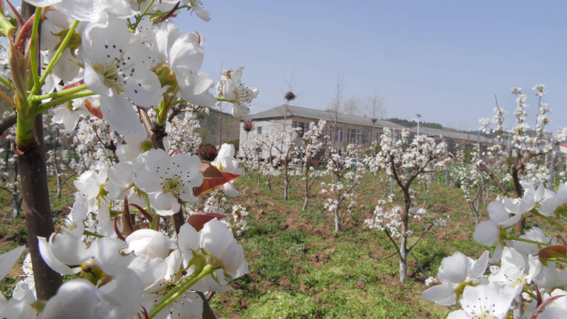 在九集镇易家湾村金果梨种植基地,远远望去,那一簇簇雪白的梨花,如团团云絮,随风轻轻摇动。梨园里,村民们正忙着除草、人工授粉。