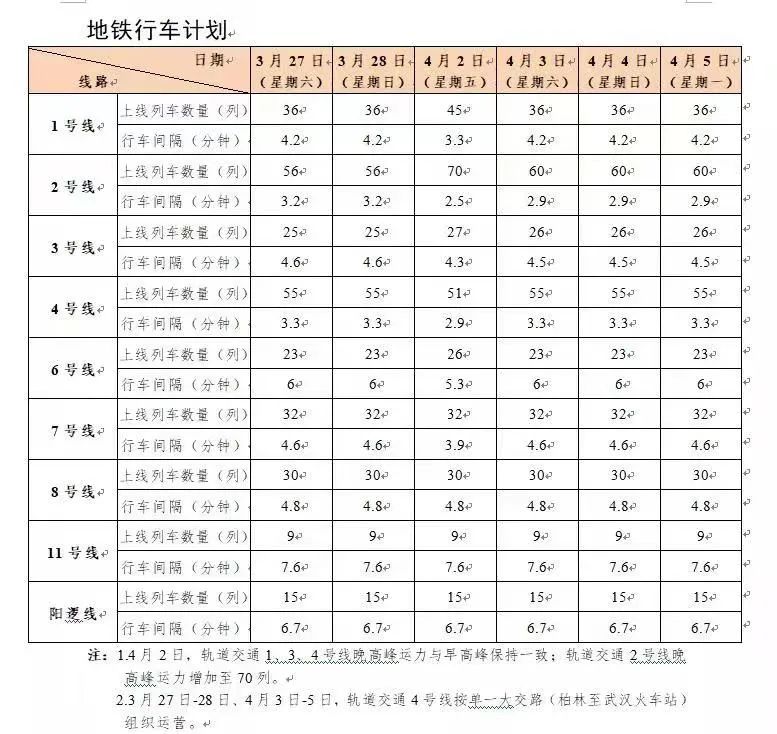 4月2日至4月5日,武汉地铁将适当增加线网各轨道交通线路客流高峰时段运力。
