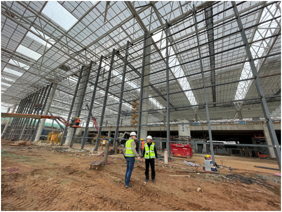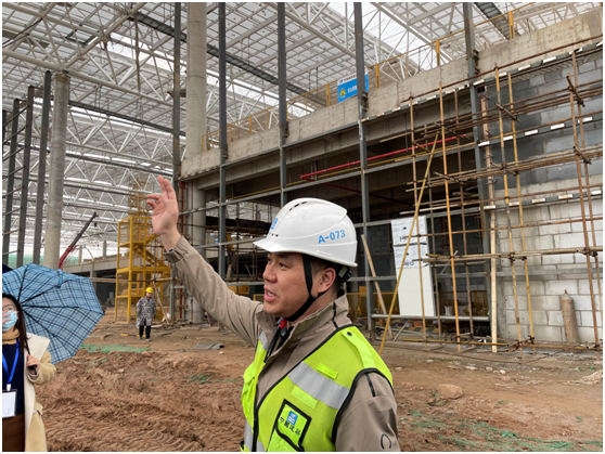 采访团首先来到了正在建设中的鄂州花湖机场,记者见到,虽然下着小雨,但施工现场仍是一片如火如荼的工作景象。“四月中旬,航站楼整个的屋面和幕墙都将施工完毕。”鄂州花湖机场房建二标项目生产经理郑哲现场说道。