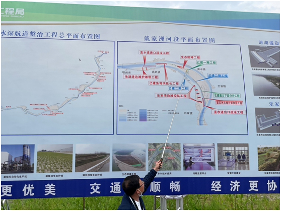 采访团一行还参观了“645“工程建设池湖港护滩带,“安庆至武汉6米水深、武汉至宜昌4.5米水深航道”简称“645”工程,2018年10月,“645工程”主体工程之一的武安段工程开工建设。工程全力打造“绿色工程”“优质工程”“平安工程”“民生工程”“廉洁工程”五位一体的“品质工程”。