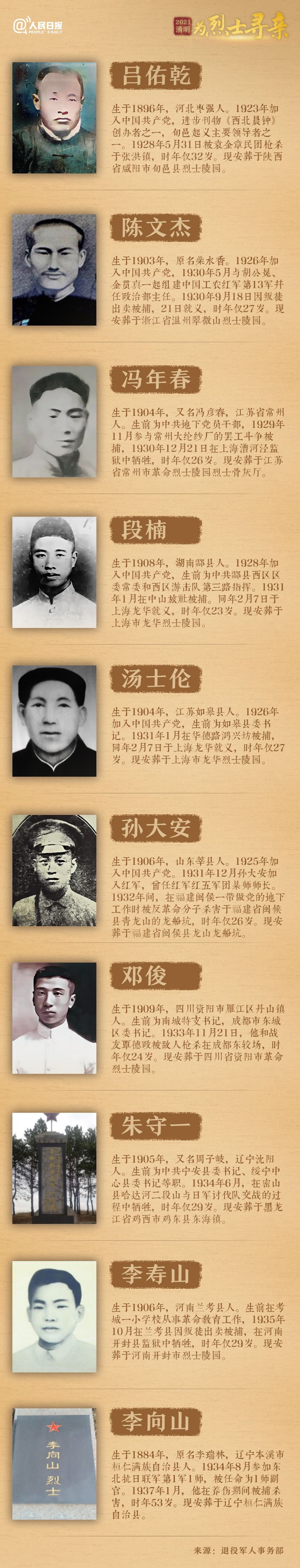 同时,退役军人事务部联合人民日报客户端等媒体,公布100位烈士的寻亲线索。这100位烈士的牺牲时间跨越1928年到1984年。烈士们生前有的是军人,有的是地下党员,有的是工人,有的是教师学生。不少烈士的出生年份等关键信息缺失,一些烈士未留下照片。