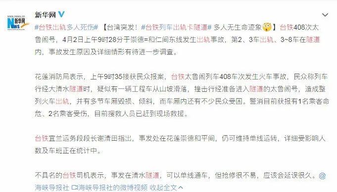 一列“太鲁阁号”408次列车,行经崇德、和平间,在花莲大清水隧道发生事故,列车乘客约350人,多人无生命征象。