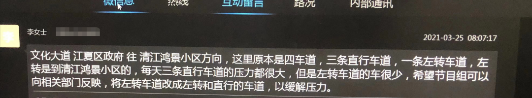 近日,楚天交通广播听友李女士向《城市新干线》节目反映,文化大道江夏区政府往清江泓景小区方向,这里原本是四车道,三条直行车道,一条左转车道,左转是到清江泓景小区的,每天二条直行车道的压力都很大,但是左转车道的车很少,希望节目组可以向相关部门反映,将左转车道改成左转和直行的车道,以缓解压力。