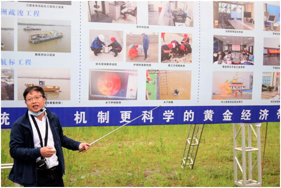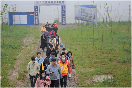 随后,采访团来到鄂州市“长江干线武汉至安庆段6米水深航道整治工程”现场。图为:采访团在工程建设现场。