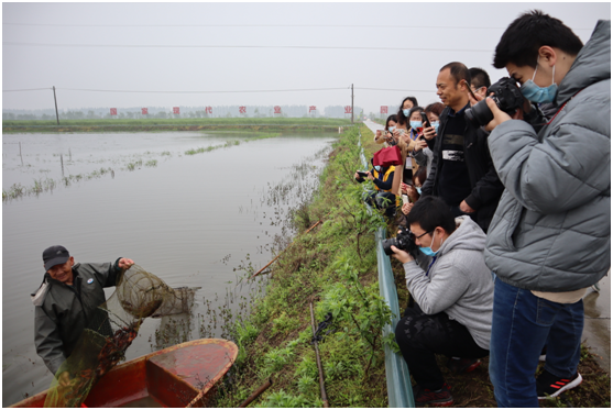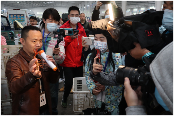 采访团的最后一站,来到了“中国小龙虾之乡”——潜江,在中国虾谷参观龙虾交易中心。图为:中国虾谷360执行总经理李红卫在为采访团介绍龙虾交易情况。