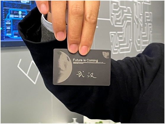 在武汉光谷未来科技城,采访团了解了全国工业互联网建设发展情况以及二级节点、标识应用和产业推广情况,体验了智能制造技术应用。图为:工作人员向记者展示通过5G智能制造系统进行激光雕刻的名片。