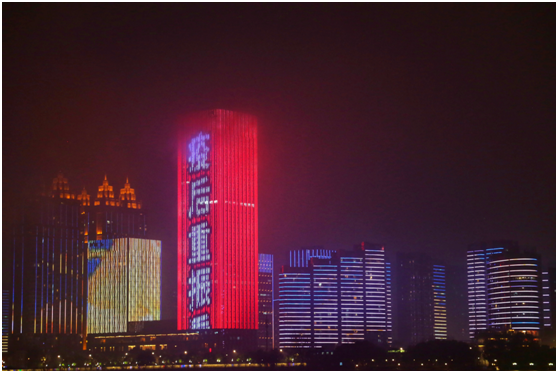 3月30日晚,采访团在武汉汉粤码头欣赏了“疫后重振看湖北”的主题灯光秀,雨中两江四岸的建筑依然流光溢彩,灯火辉煌。