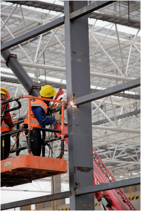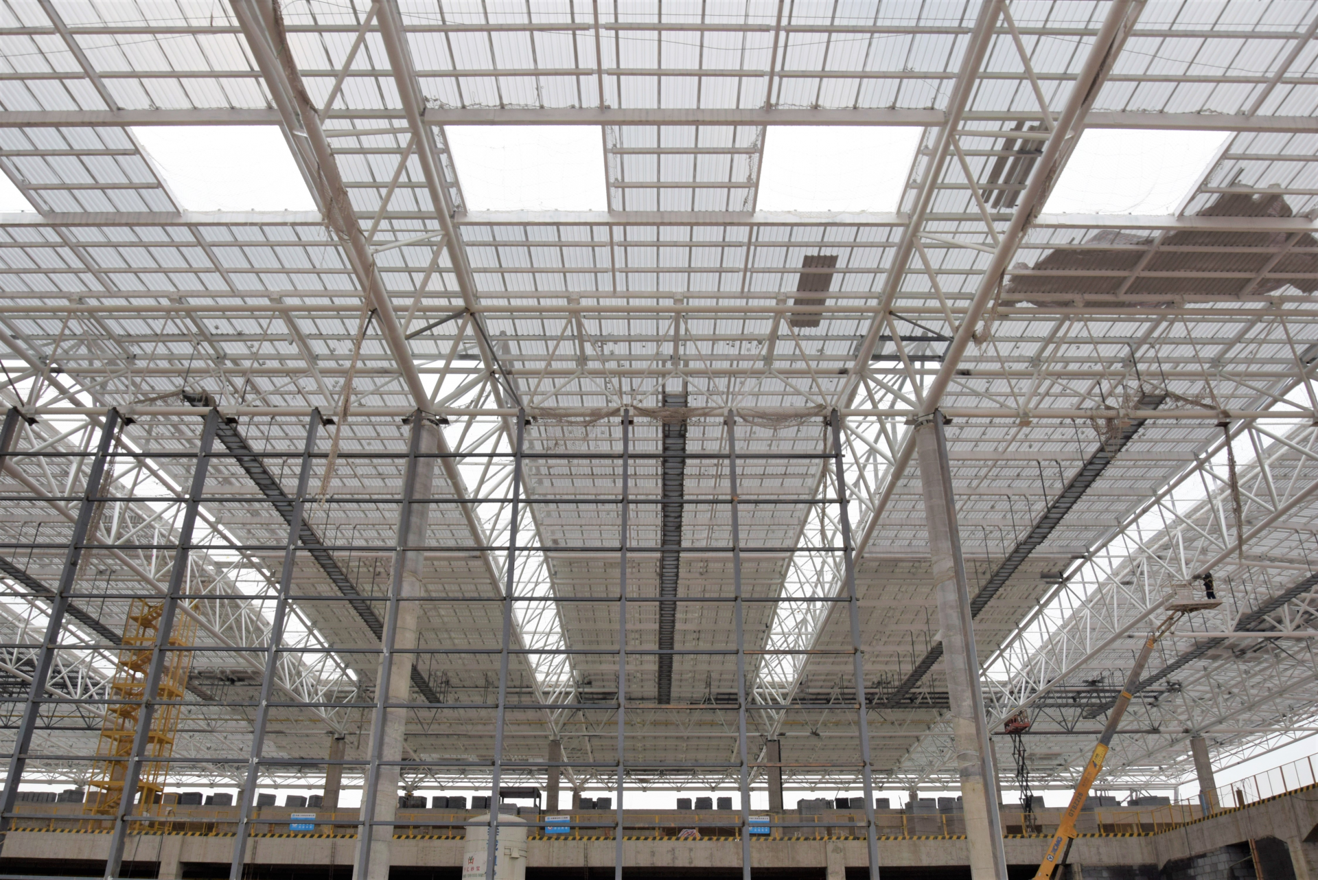 鄂州花湖机场是我国第一个获批建设的货运枢纽机场,据悉,鄂州花湖机场将力争在今年年底建成并启动校飞。图为:现场工人正在做航站楼的龙骨衔接工作。