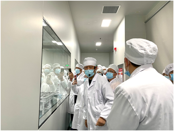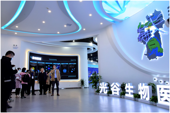 在隶属于东湖高新集团的光谷生物医药加速器,采访团了解到,该基地为湖北疫情防控及复工复产提供了有效保障。图为:采访团在光谷生物医药加速器。