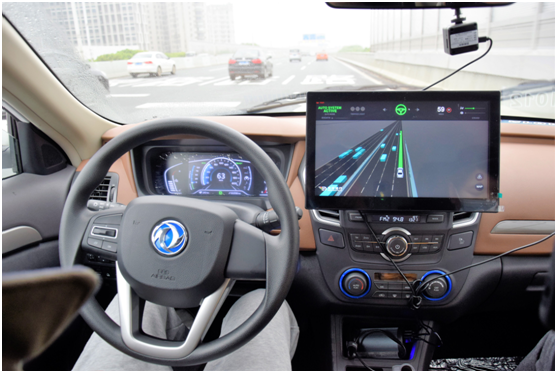 图为:车辆自动驾驶过程中,安全员不进行任何操控,车内配有显示周围路况信息的屏幕。