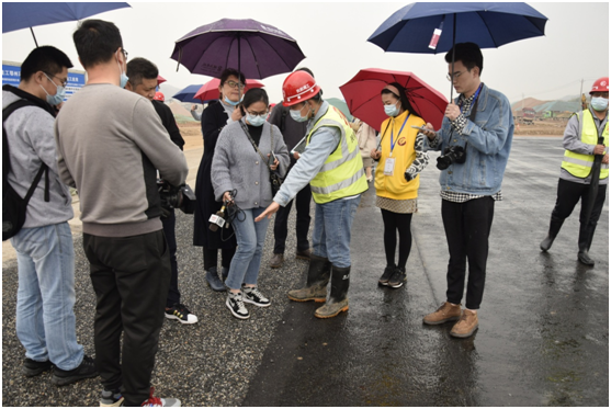 图为:在机场跑道上,工作人员正在向记者介绍机场建设有关情况。