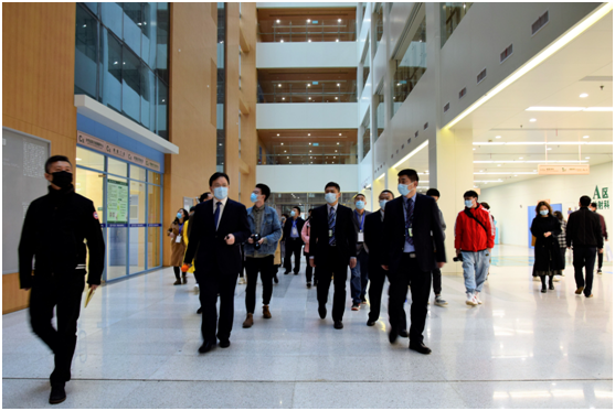 同济医院光谷院区是全国唯一一个先授牌后建设的国家重大公共卫生医学中心,采访团来到同济医院光谷院区,了解相关情况。图为:采访团走进同济医院光谷院区。