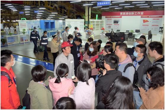 图为:采访团在东风汽车集团有限公司总装车间生产线采访车间工作人员。