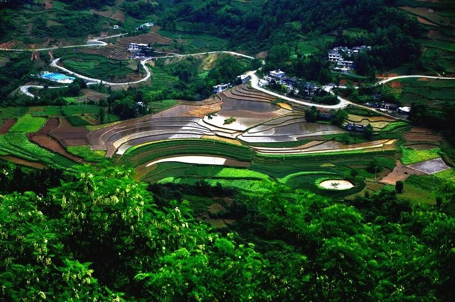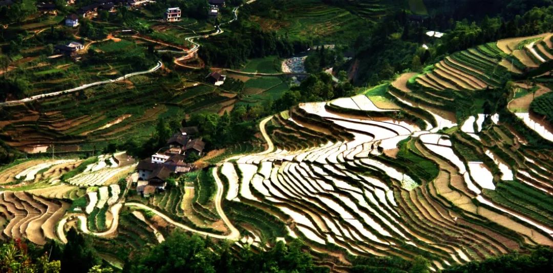 潘家湾是一片神奇的土地,鬼斧神工雕凿而成的层层梯田、云雾缭绕的山野村庄、自然淳朴的民间风情,随处可定格为一幅绚丽迷人的风情画。春来,水满田畴,一块连着一块,一层接着一层,大大小小,形态各异,有的似圆盘,有的状如葫芦,如串串银链,直挂山麓。