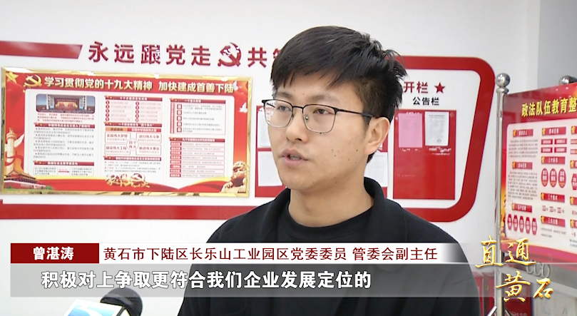 黄石市下陆区长乐山工业园区党委委员、管委会副主任曾湛涛:“积极对上争取更符合我们企业发展定位的高含量的政策支持,坚持服务为本,持续优化我们的营商环境,加强我们辖区落户企业的管理,有序地推进我们各个项目的项目建设。”