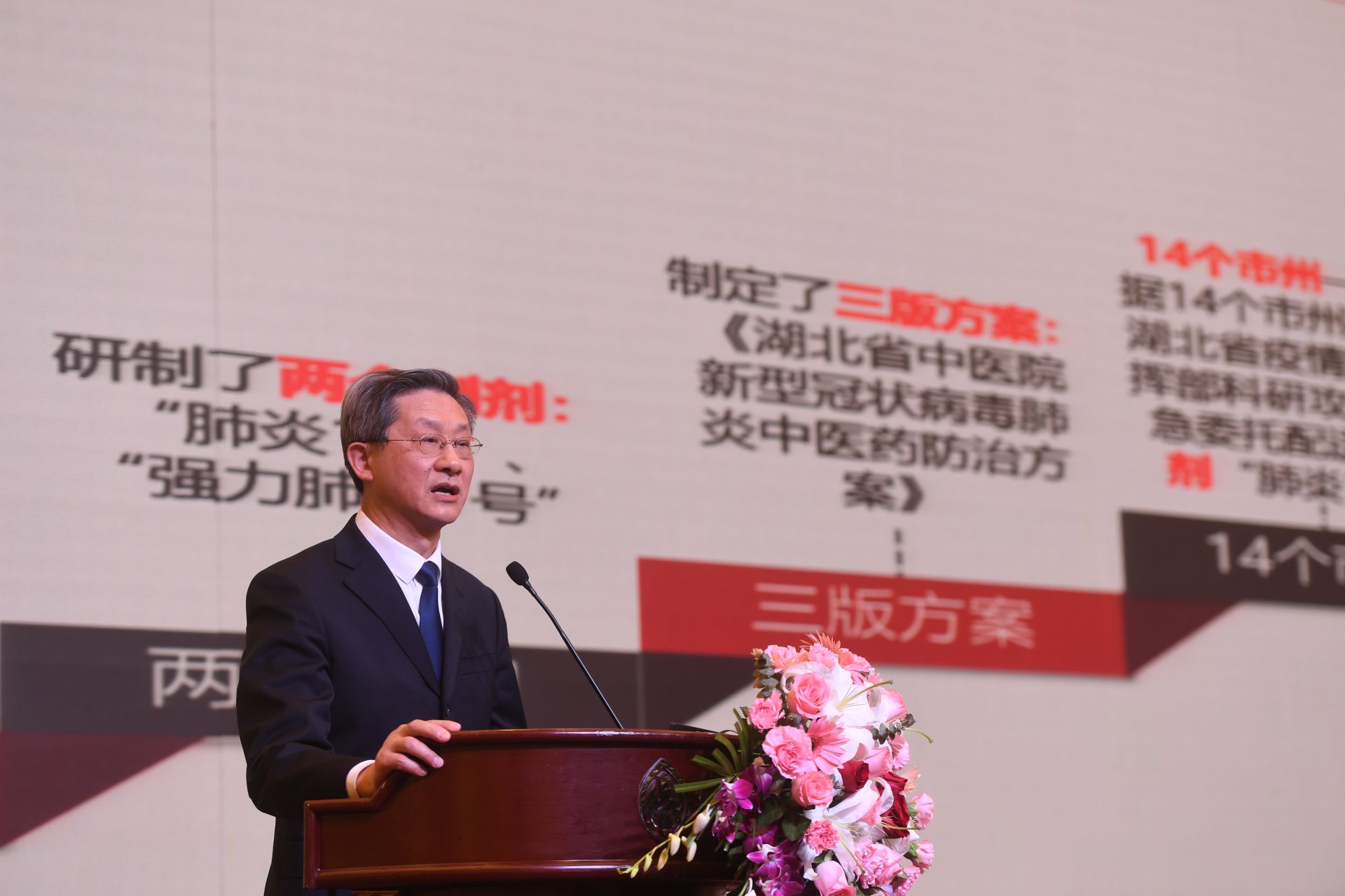 在抗击新冠肺炎疫情武汉保卫战、湖北保卫战取得决定性成果、武汉解除离汉通道管控一周年之际,4月10日,由湖北省中医药学会、湖北省中西医结合学会、湖北中医药大学共同主办的湖北省中医药防治新冠肺炎学术大会在武汉召开。大会以“弘扬伟大的抗疫精神 推进中医药传承创新”为主题,立足传承创新,围绕中医药、中西医结合抗疫理论、临床、科研进行深入交流,分享中医药抗疫的智慧和力量。会议采取线上线下相结合方式进行,来自全省中医药行业各条战线的400余名中医药工作者现场与会,这是湖北省中医药和中西医结合学术界高水平、高层次、具有纪念意义的一场学术盛会。