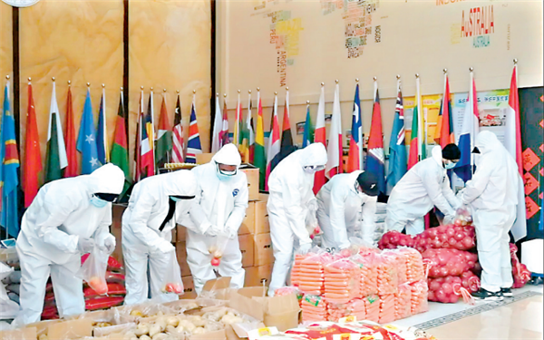 疫情期间,中国地质大学(武汉)丝绸之路学院贝宁籍国际学生大明与巴基斯坦、也门、塔吉克斯坦、卢旺达等13个国家的留学生共同组建了23人的“钢铁侠”留学生志愿队,配合学校为320名在校留学生提供日常生活保障。