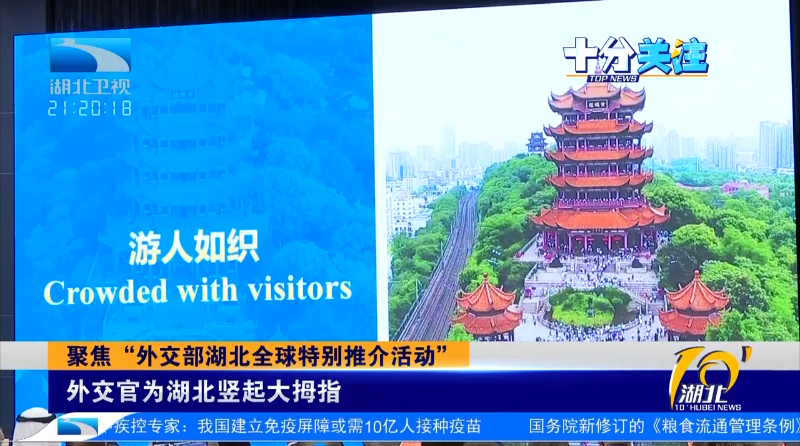 记者尚大原:“外交部湖北全球特别推介活动,向世界展示了荆楚大地上,一个个众志成城的战疫瞬间,与活力回归的市场,轰鸣生产的车间,浴火重生的湖北V字型重振加速跑,引来各界来宾点赞。”