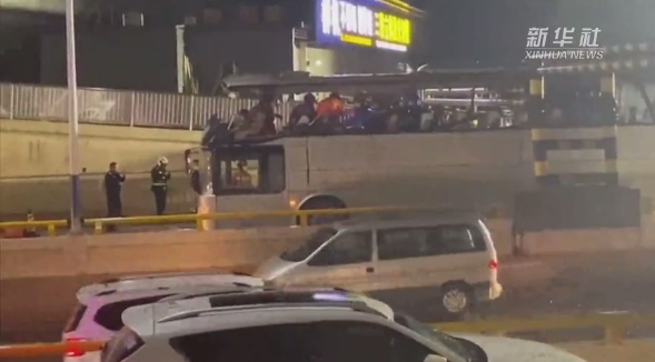现场视频显示,大巴车顶被沿着玻璃窗削掉了三分之二,事发后车上大部分有行动能力的乘客自行下车,有乘客被困,消防部门随后赶来救援。据大象新闻报道,这辆旅游大巴车为桂A牌照,车上有乘客53名,加上司机和导游共55人。