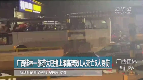 18日凌晨,桂林交警发布通报称,17日20时10分许,桂林市象山区环城西二路西门菜市铁路立交由东往西方向,发生一起大客车撞限高栏的道路交通事故。事故造成1人死亡,6人受伤。伤者已送医救治,无生命危险。