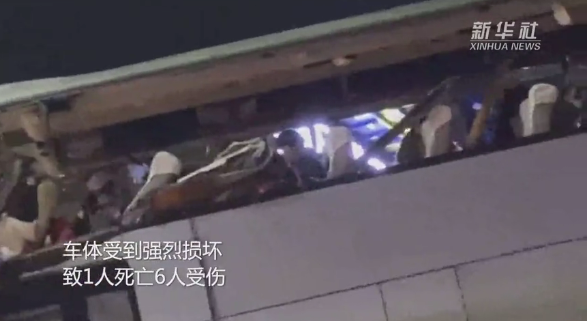 一旅游大巴撞上限高架,车顶被削掉三分之二,致1死6伤!