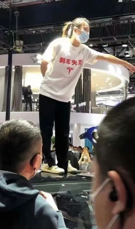 据了解,现场一共有两位女士身穿“刹车失灵”字样的T恤出现在特斯拉展台。其中一名女子行为过激,爬上车顶,还出现了砸车动作。有10余名保安在现场维持秩序。