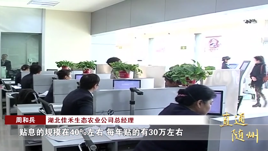 湖北佳禾生态农业公司总经理周和兵:“我们感觉到(政府)还是非常重视的,申请项目包括贷款贴息都在落实,贴息的规模在40%左右,每年贴的有30万左右,我总贷款额度有2000多万。”