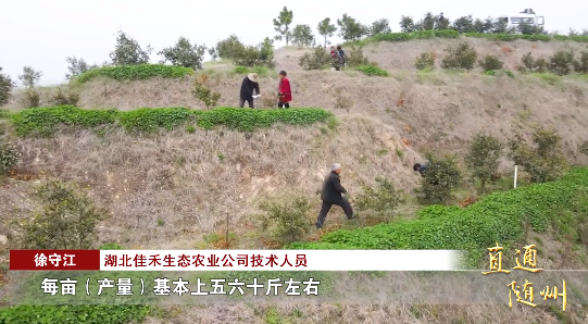 湖北佳禾生态农业公司技术人员徐守江:“现在我们品种好,品种技术我们跟上了,2015年栽的,现在已经开始丰产,每亩(产量)基本上五六十斤左右。”