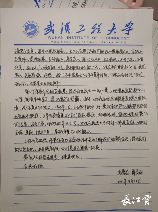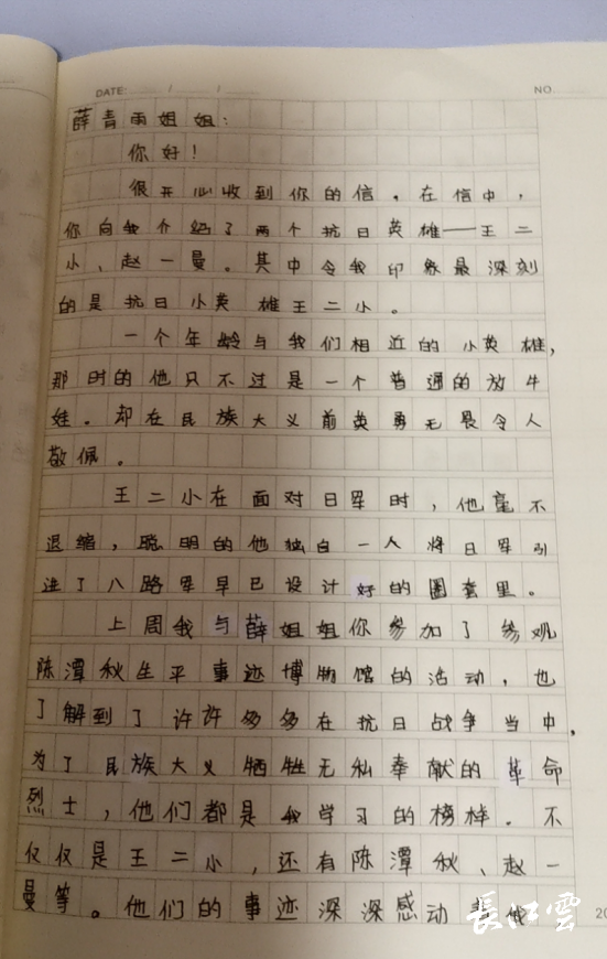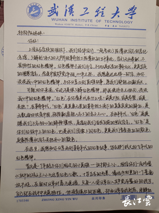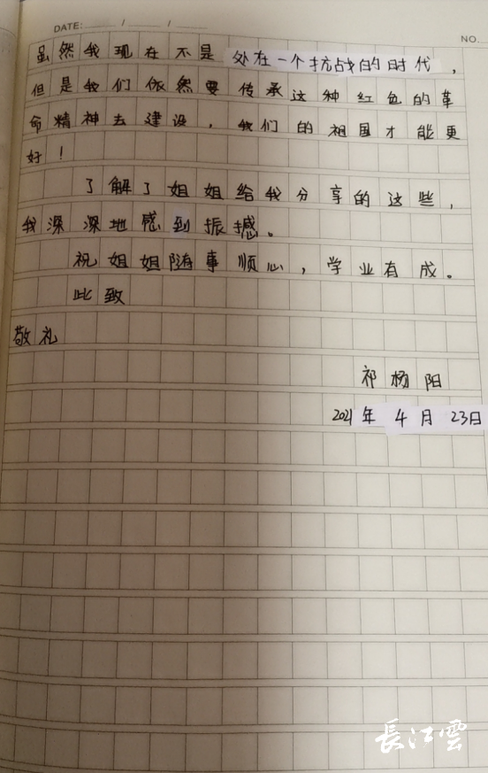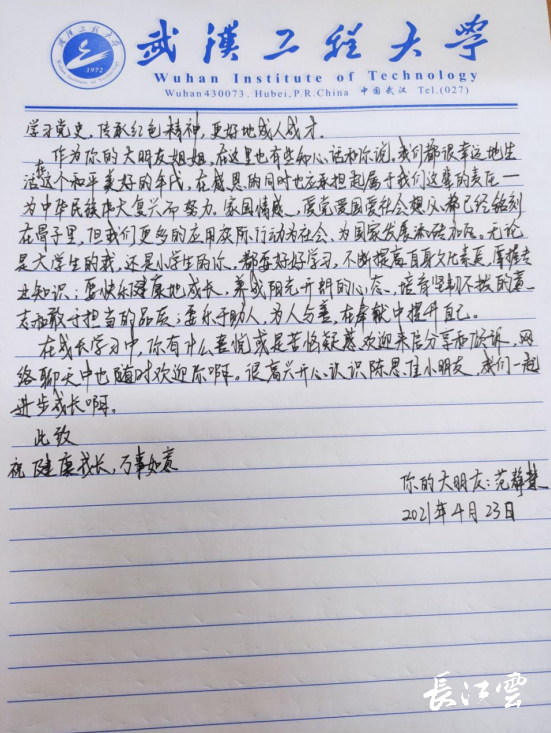 志愿者范静慧在给小朋友陈思佳的信中写道:“很幸运能生在这个和平的年代,爱国早已深入骨髓,在感恩的同时,我们更要肩负起这个时代赋予我们的责任,好好学习、提高本领、勇于担当、乐于奉献,为中华民族伟大复兴贡献力量。”小学生陈思佳表示:“要好好学党史、知党恩、跟党走,将来为建设祖国贡献力量。”