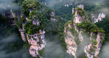 首推世界第一长的绝壁栈道,全长6300米,悬空于方山云海之中,整个景区的景观尽揽眼底。高达600多米的悬空栈道之上,随处可见奇峰怪石,群峰千姿百态——似雄鹰、如卧佛、似指掌、如灵猴、似笔锋......置身悬崖,一揽众山小,可将美景奇葩尽收眼底。