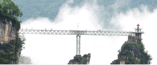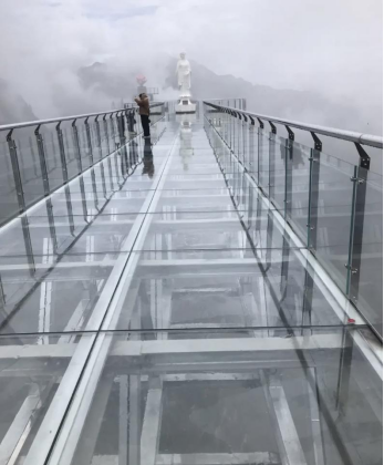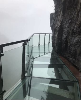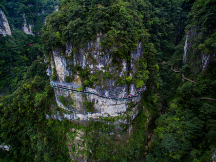 接下来是绝壁玻璃栈道,该玻璃栈道于2016年4月30日正式对游客开放。这个可眼观四方美景,尽享惊险刺激的玻璃栈道,总长度为236米,相对高差166米,是国内目前长度最长的绝壁玻璃栈道。栈道中间,建有一座15米长的玻璃拱桥,取名为“云鹊桥”。